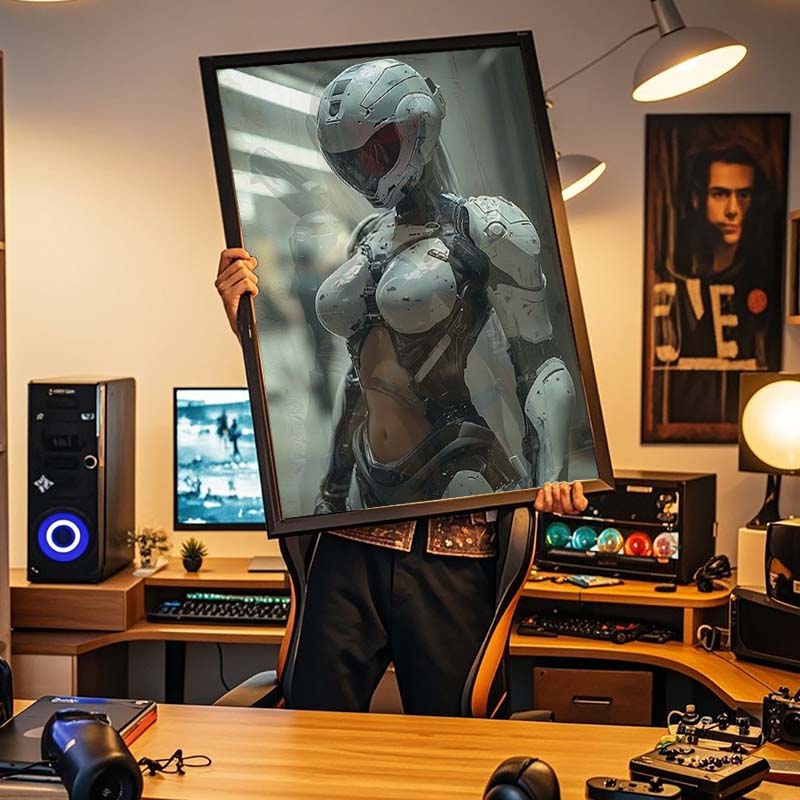 Tauche ein in die Welt der futuristischen Action: Das Cyborgina Poster zeigt eine starke Cyborg-Kämpferin, wie aus einem epischen Shooter-Spiel inspiriert. Das Artwork erinnert an Kult-Titel wie Fortnite oder PUBG und vereint Gaming-Ästhetik mit moderner Poster-Kunst.