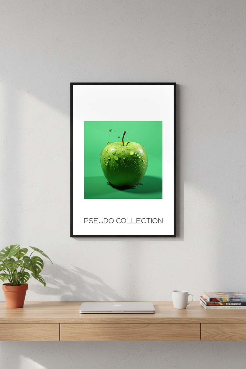 Modernes Poster-Motiv als Digital-Download: Ein frischer, grüner Apfel, bedeckt mit glänzenden Wassertropfen vor leuchtend grünem Hintergrund. Perfekt als Farbakzent für Küche, Essbereich, Büro oder als außergewöhnliches Geschenk. Die Datei kann flexibel in verschiedenen Formaten bis zur Maximalgröße 50x75 cm gedruckt werden. Einfach downloaden und im Drogeriemarkt günstig drucken lassen – für sofortigen Frischekick an jeder Wand!