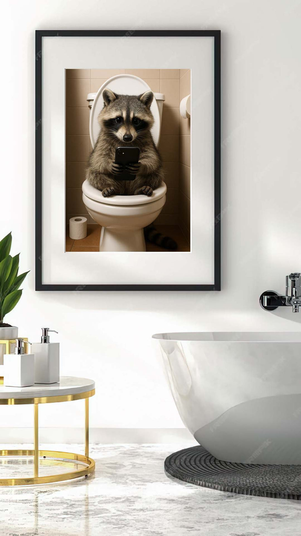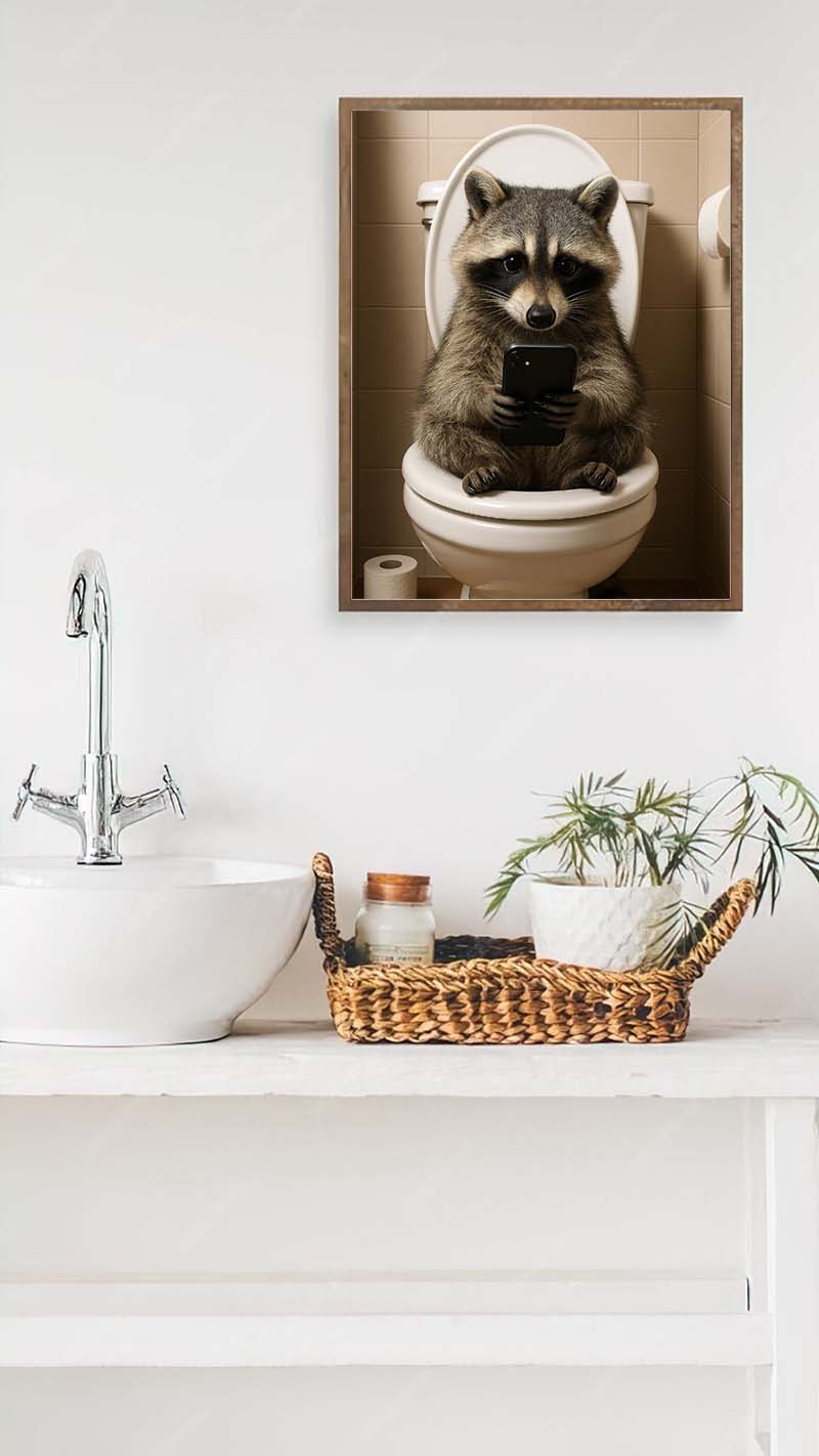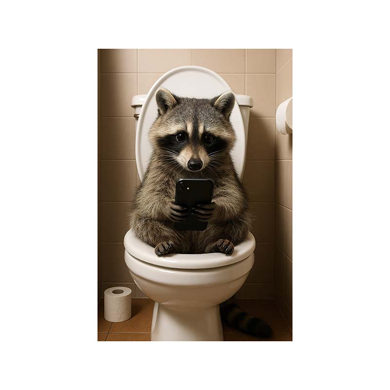 Waschbär auf dem Klo mit Smartphone – Digitales Poster JPG – Lustige Badezimmer-Deko zum Ausdrucken