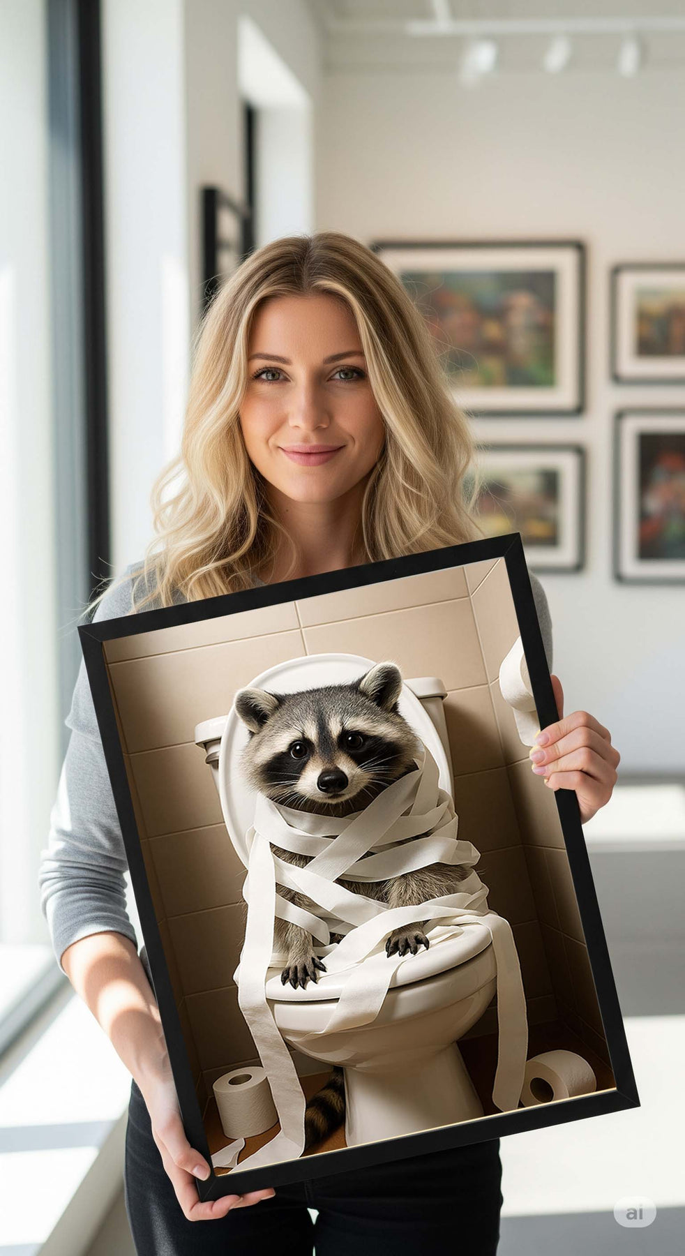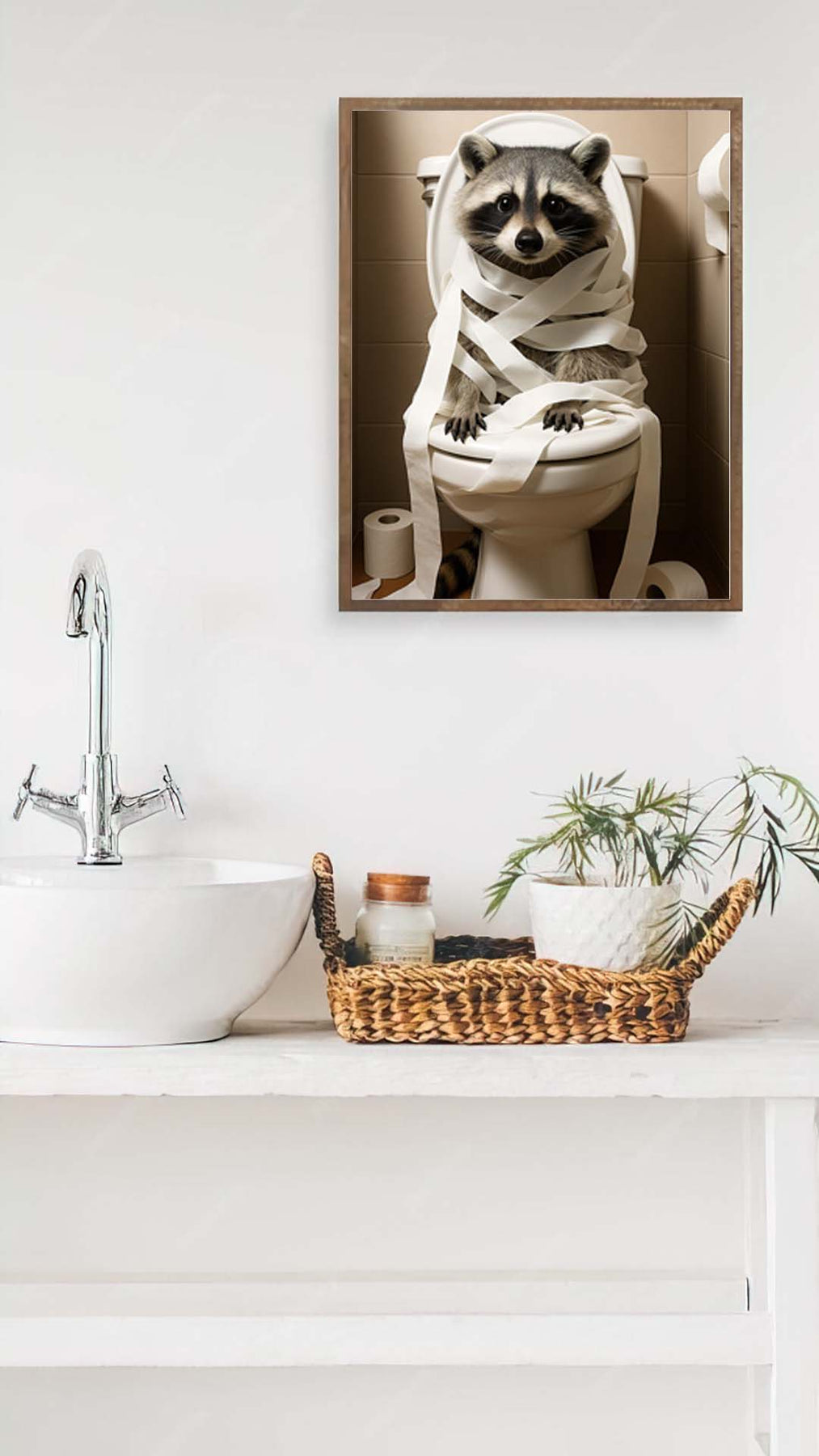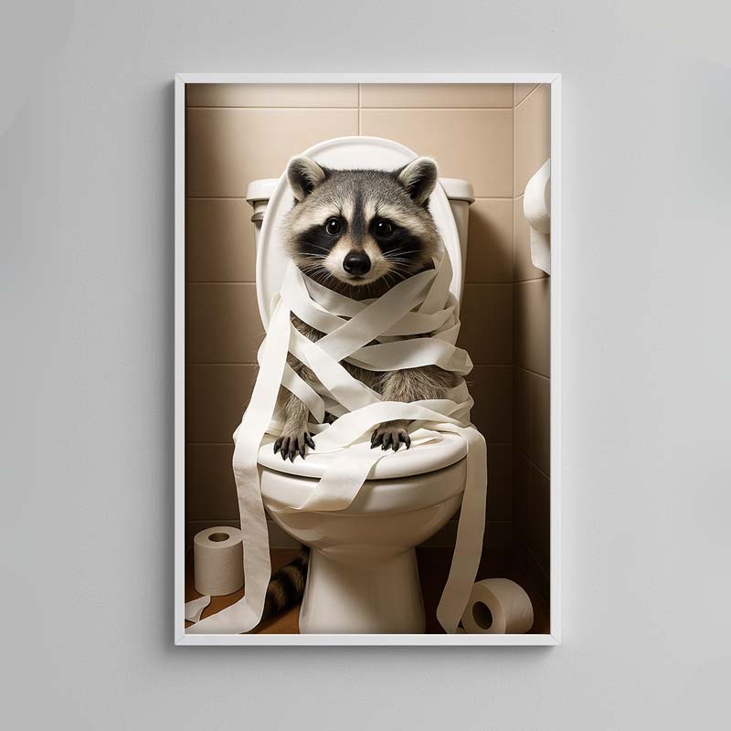 Sag Tschüss zu langweiliger Deko und bring Stimmung ins Badezimmer: Das digitale Poster zeigt einen Waschbären beim wohl persönlichsten Moment – komplett eingewickelt in Toilettenpapier. Ob Gästetoilette, Bad oder Büro: Dieses Motiv sorgt garantiert für Lacher und Gesprächsstoff!